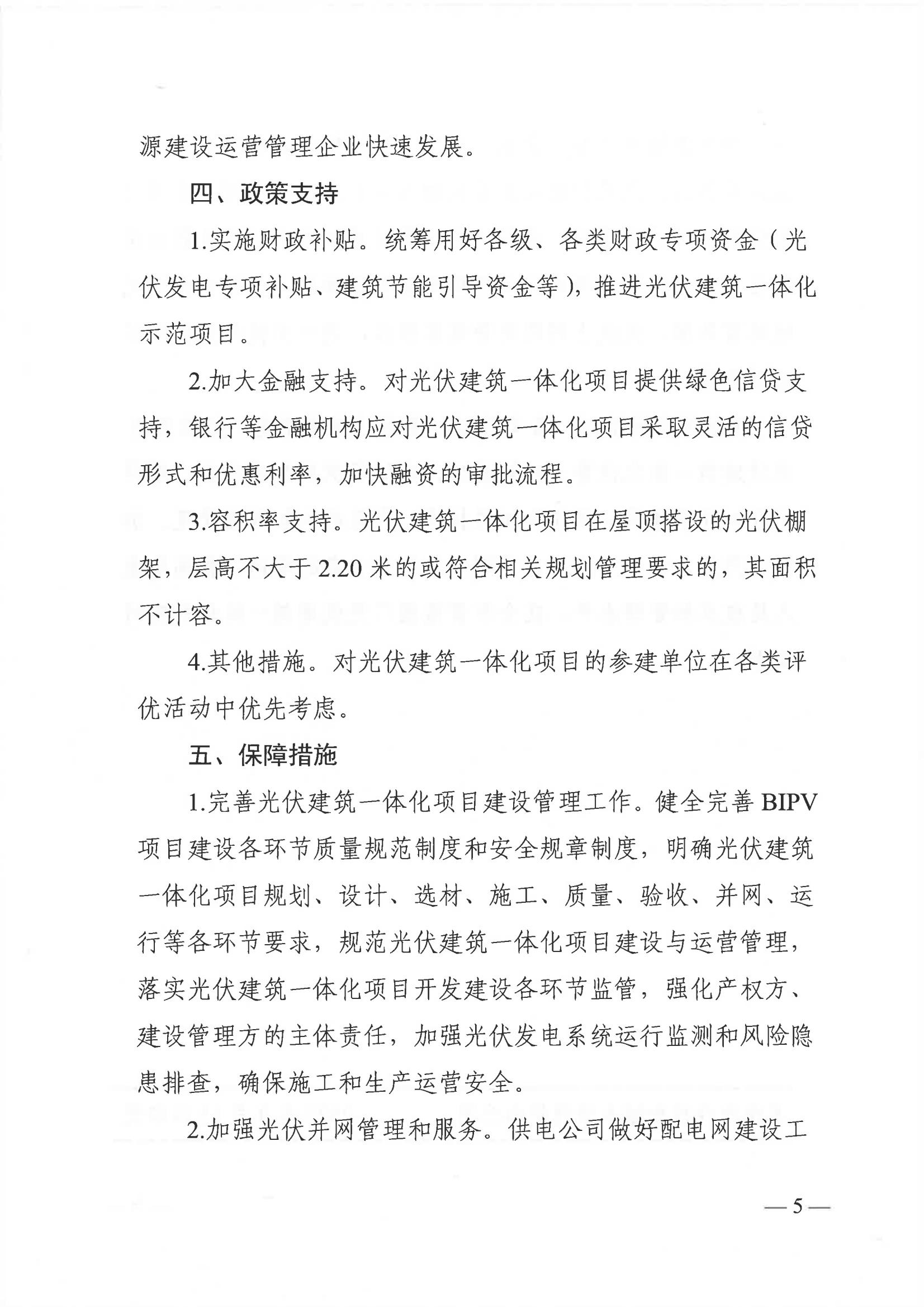 推進(jìn)光伏建筑一體化規模應用。充分利用工業(yè)廠(chǎng)房、公共建筑等建筑屋頂、外立面或其他適宜部位,按照“宜建盡建"原則積極開(kāi)展光伏建筑一體化項目建設。對政府(含國有企業(yè))投融資的2萬(wàn)平方米以上的新建公共建筑,將BIPV要求納入規劃條件。結合城市更新推進(jìn)光伏產(chǎn)品在既有建筑上應用,機關(guān)辦公建筑在進(jìn)行改擴建時(shí),具備條件的應進(jìn)行光伏建筑一體化改造。有條件的光伏建筑一體化項目配建一定比例儲能設施到2025年底,各縣級市(區)均應建成一批光伏建筑一體化項目,發(fā)揮示范引領(lǐng)作用。