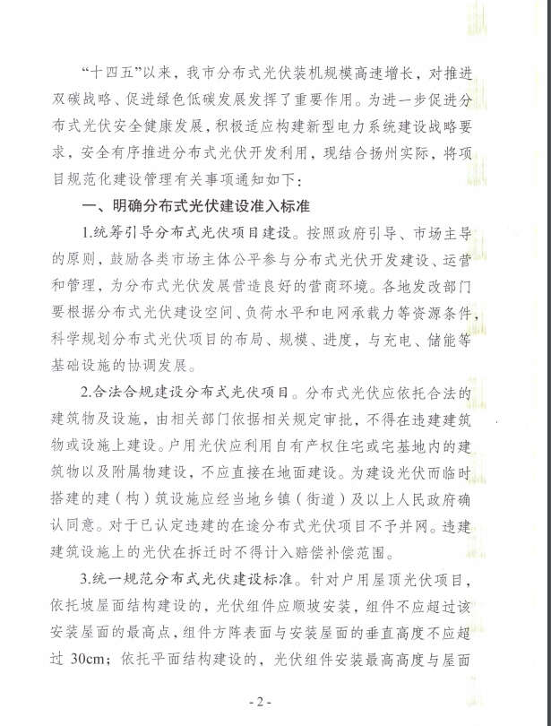 日前,揚州市發(fā)改、自規、住建、城管、農業(yè)農村、應急管理、行政審批、供電公司等部門(mén)聯(lián)合下發(fā)《關(guān)于進(jìn)一步規范我市分布式光伏項目建設管理的通知》,重點(diǎn)圍繞分布式光伏建設準入標準、優(yōu)化前期管理手續、提升并網(wǎng)接入服務(wù)、規范并網(wǎng)管理和加強合規運行監督五個(gè)方面,明確了具體舉措。