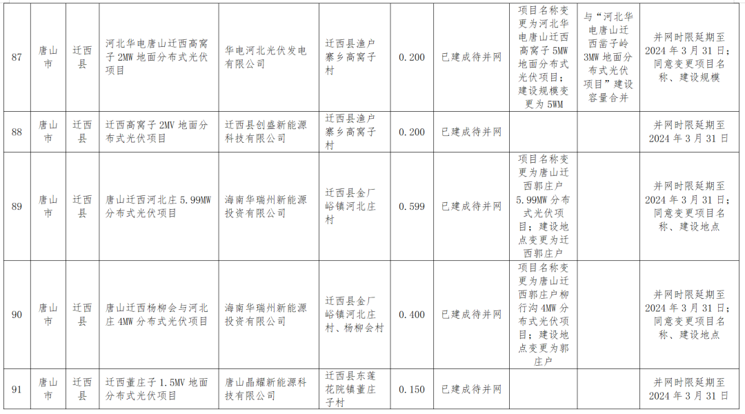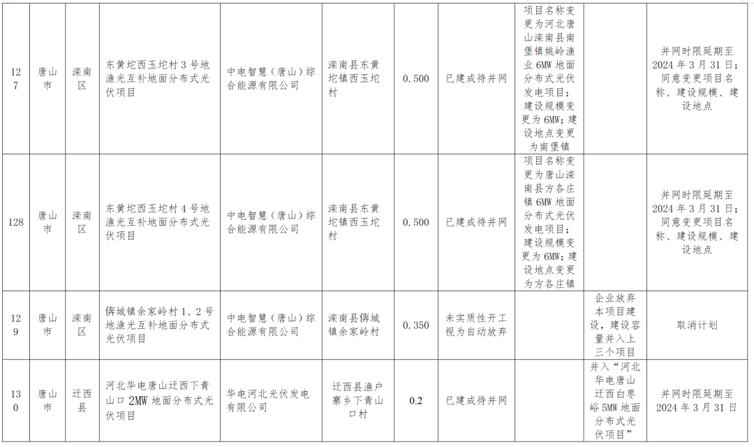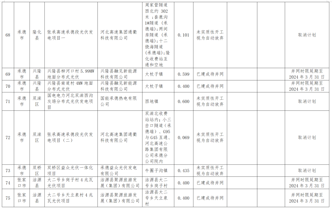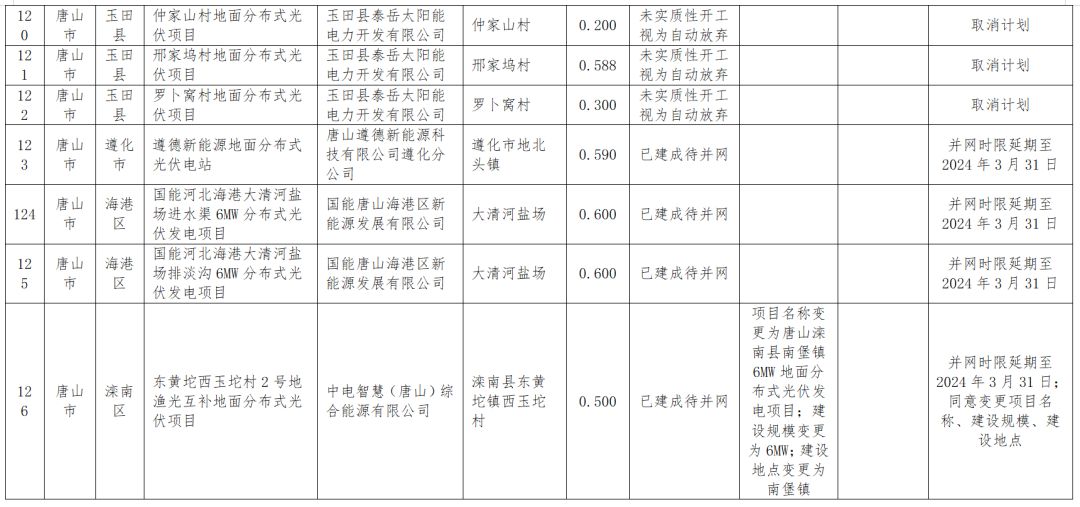 1月18日,河北能源局公示四季度風(fēng)光集中并網(wǎng)行動(dòng)到期風(fēng)電、光伏項目擬調整情況,被調整的共涉及100MW風(fēng)電、2.17GW光伏以及1.2GW地面光伏項目,其中部分項目取消計劃,還有一部分轉為儲備類(lèi)或者延遲并網(wǎng)。調整項目涉及的業(yè)主包括特變電工、中廣核、大唐、英利、深能、國華等。