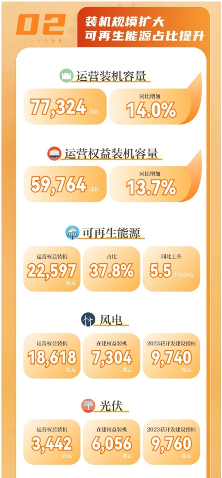 2023年新投產(chǎn)的風(fēng)電和光伏項目權益裝機容量分別為3106兆瓦和2230兆瓦。2023年,本集團自建風(fēng)電和光伏新增并網(wǎng)裝機6458兆瓦,并購可再生能源項目權益裝機約1220兆瓦,合計7678兆瓦。