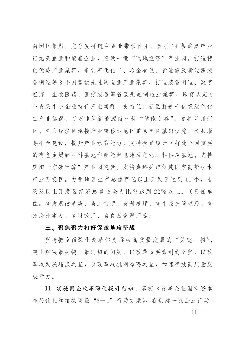 壯大提升園區經(jīng)濟增長(cháng)極。推動(dòng)項目向園區集中、產(chǎn)業(yè)向園區集聚,充分發(fā)揮鏈主企業(yè)帶動(dòng)作用,吸引14條重點(diǎn)產(chǎn)業(yè)鏈龍頭企業(yè)和配套企業(yè),建設一批“飛地經(jīng)濟”產(chǎn)業(yè)園。打造特色優(yōu)勢產(chǎn)業(yè)集群,爭創(chuàng )石化化工、冶金有色、新能源及新能源裝備制造等3個(gè)國家級先進(jìn)制造業(yè)產(chǎn)業(yè)集群,打造裝備制造、數字經(jīng)濟、生物醫藥、醫療裝備等省級先進(jìn)制造業(yè)集群,培育認定5個(gè)省級中小企業(yè)特色產(chǎn)業(yè)集群。支持蘭州新區打造千億級綠色化工產(chǎn)業(yè)集群、百萬(wàn)噸級新能源新材料“儲能之谷”。支持蘭州新區、蘭白經(jīng)濟區承接產(chǎn)業(yè)轉移示范區重點(diǎn)園區基礎設施、公共服務(wù)平臺建設,提升產(chǎn)業(yè)承載能力。支持金昌經(jīng)開(kāi)區打造全國重要的有色金屬新材料基地和新能源電池及電池材料供應基地。支持慶陽(yáng)“東數西算”產(chǎn)業(yè)園建設。