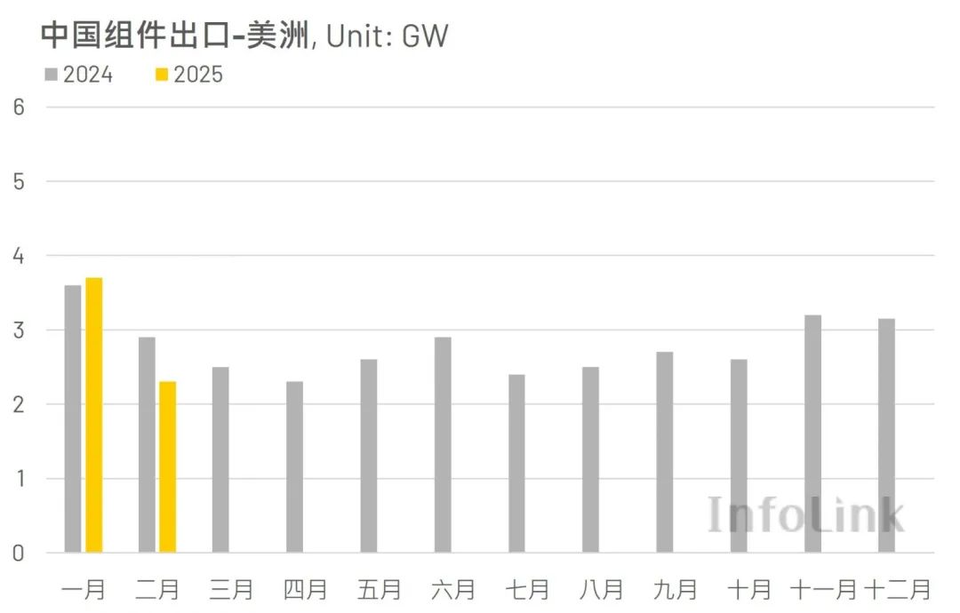 2025 年 1 月中國共出口美洲市場(chǎng)約 3.71 GW 的光伏組件,與 2024 年 1 月的 3.6 GW 相比上升 3%;二月則出口約 2.34 GW 的光伏組件,與去年二月的 2.92 GW 相比下降 20%。截至今年二月底,中國一至二月共出口美洲市場(chǎng)約 6.05 GW 的光伏組件,同比去年 6.52 GW 下降 7%。